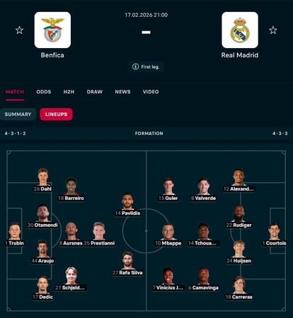 Trajneri Arbeloa nuk ka kursyer yjet, sistemi 4 – 3 – 3. Nga minuta e parë do të jenë “tridhëmbëshi” Vinicius – Mbappe – Guler, ndërsa Benfica përgjigjet me Rafa Silva e Pavlidis.