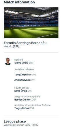 Kryesorë do të jetë një slloven. Bëhet fjalë për Slavko Vincic. Ky i fundit i njeh mirë të dyja ekipet, pasi i ka gjykuar në të kaluaën. Madrilenët 2 herë, në finalen e “Wembley”, ku fituan 2-0 ndaj Dortmund dhe në fazën e grupeve ndaj Milan, ku humbën 3-1.