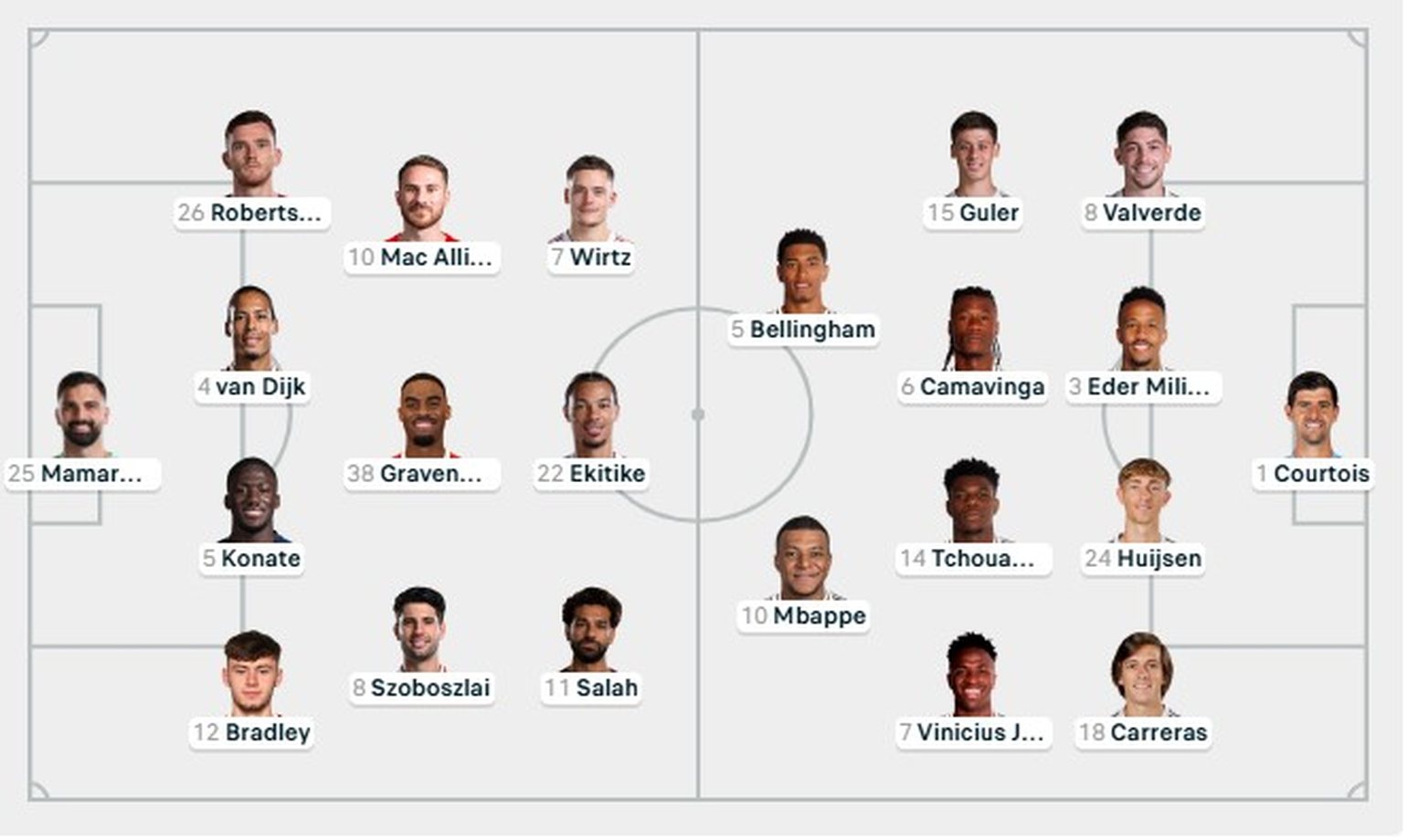 Trajneri Arne Slot nga kampi i Liverpool ka shkaktuar jo pak habi, duke lënë në stol Gakpo dhe vendosur në pozitën e titullarit në linjat e sulmit Wirtz. Xabi Alonso luan me sistemin 4-4-2, në majë të sulmit ndodhen Mbappe dhe Bellingham.