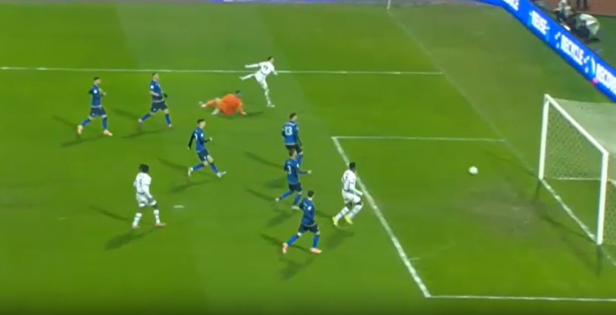 38' - Sulmuesi Vedat Muriqi humb rast flagrant me kokë, gabon në "shënjestër".