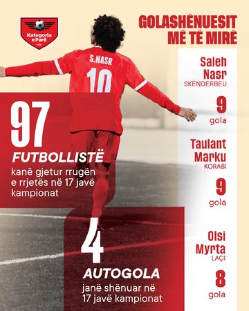 Saleh Nasr i Skënderbeut dhe Taulant Marku i Korabit kryesojnë listën me nga 9 gola secili, ndërsa Olsi Myrta i Laçit ka shënuar 8 gola.