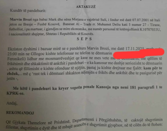 Ish-portieri i Kukësit e tashmë i Vushtrrisë, Marvin Brozi, është vënë nën hetim pasi dyshohet për kërcënime ndaj një anëtari të stafit teknik të Feronikelit. Sipas aktakuzës, ngjarja lidhet me një telefonatë ku janë përdorur fjalë fyese dhe kërcënuese.