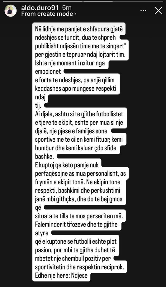 Faleminderit tifozëve dhe të gjithë atyre që e kuptojnë se futbolli është plot pasion, por mbi të gjitha duhet të mbetet një shembull pozitiv për sportivitetin dhe respektin reciprok. Edhe një herë: ndjesë”, shkruhet në “Insta-Story”.