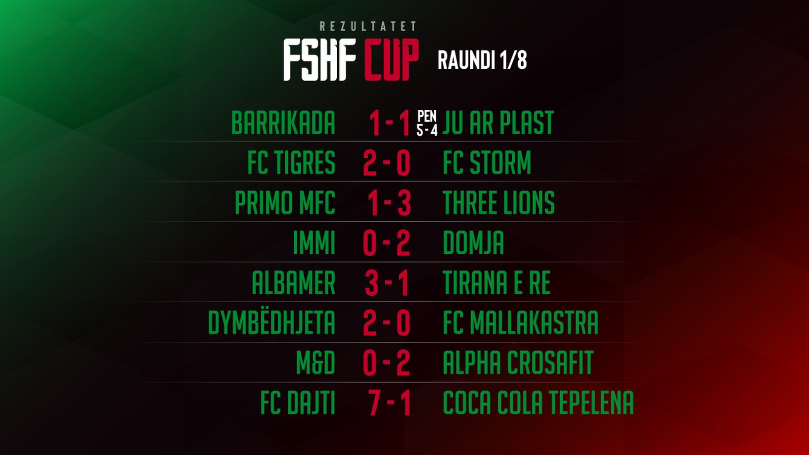 Në një nga sfidat më të balancuara, Barrikada u kualifikua ndaj Ju Ar Plast pas goditjeve të penalltive, ndërsa FC Dajti regjistroi fitoren më të thellë të kësaj faze. Skuadra të tjera si Albamer, Three Lions, Domja dhe Alpha CrossFit siguruan kualifikimin pas paraqitjeve bindëse.