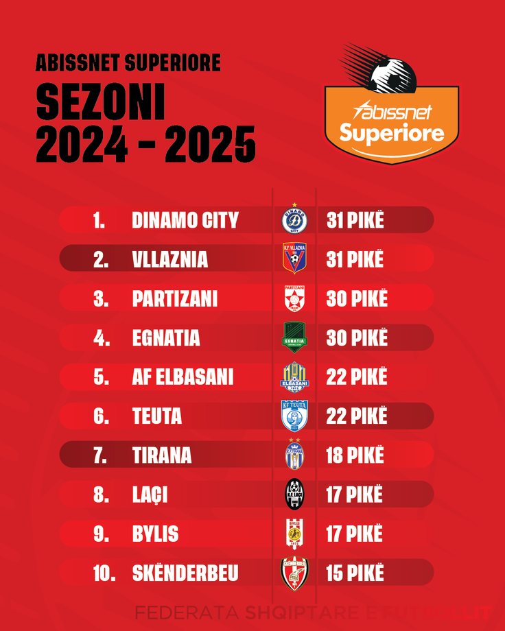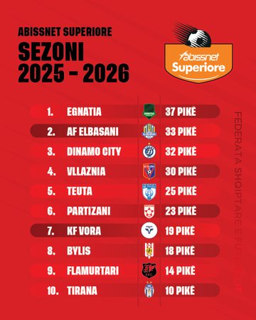 Në sezonin aktual është Egnatia që kryeson me 37 pikë, e cila ndiqet nga Elbasani me 33 pikë, 32 pikë ka Dinamo, ndërsa Vllaznia ka 30 pikë. Në mesin e artë ndodhet teuta me 25 pikë, ndërsa Partizani me 23 të tilla.