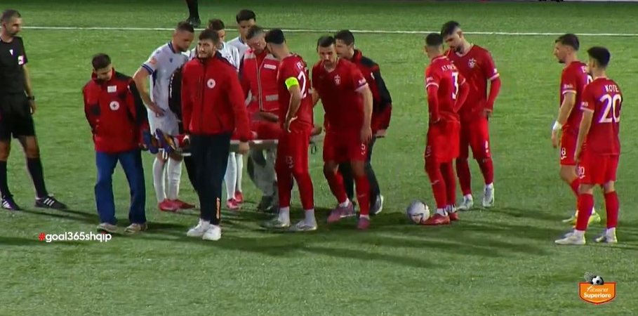 14' - Rrëzim në limitet e zonës, për Indrit Myrtjan nuk ka asgjë serioze.