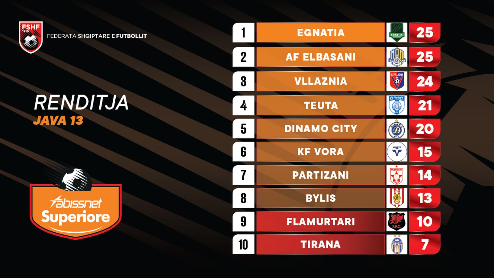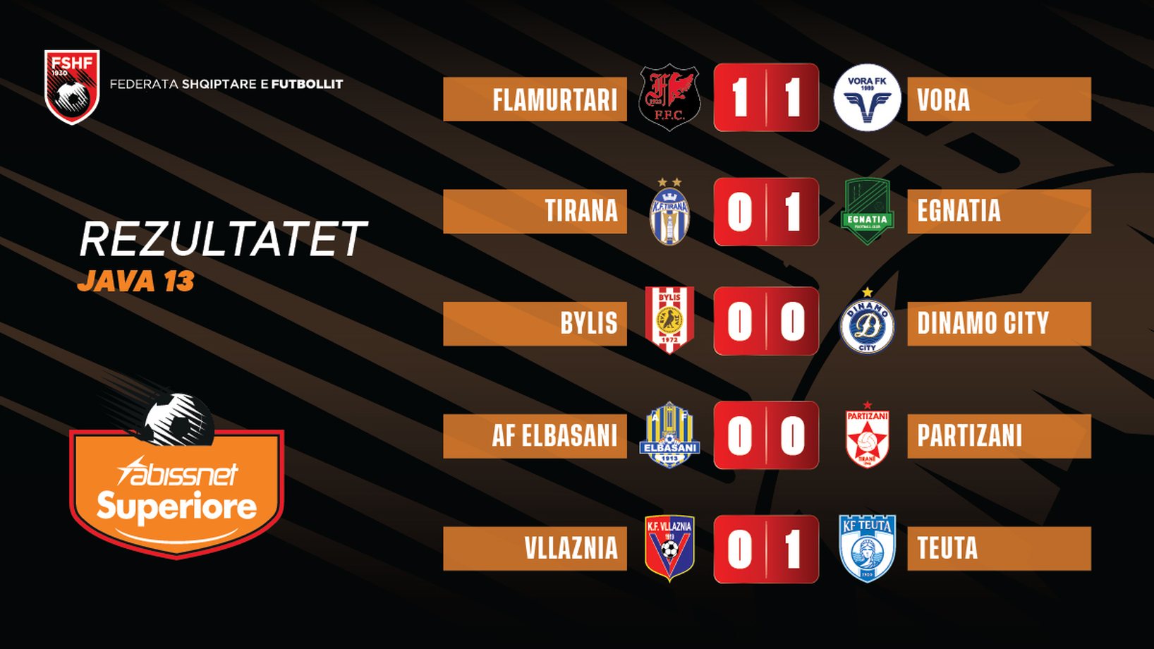 Superiorja ditën e djeshme mbylli ndeshjet e javës së 13-të të kampionatit. Rezultatet të rëndësishme janë marrë nga ekipet. Kështu Egnatia mundi Tiranën minimalisht 1-0 në “Selman Stërmasi”. Rrogozhinasit, falë këtij triumfi, u ngjitën në vendin e parë me 25 pikë, po aq sa AF Elbasani, që barazoi 0-0 me Partizanin në “Elbasan Arena”.